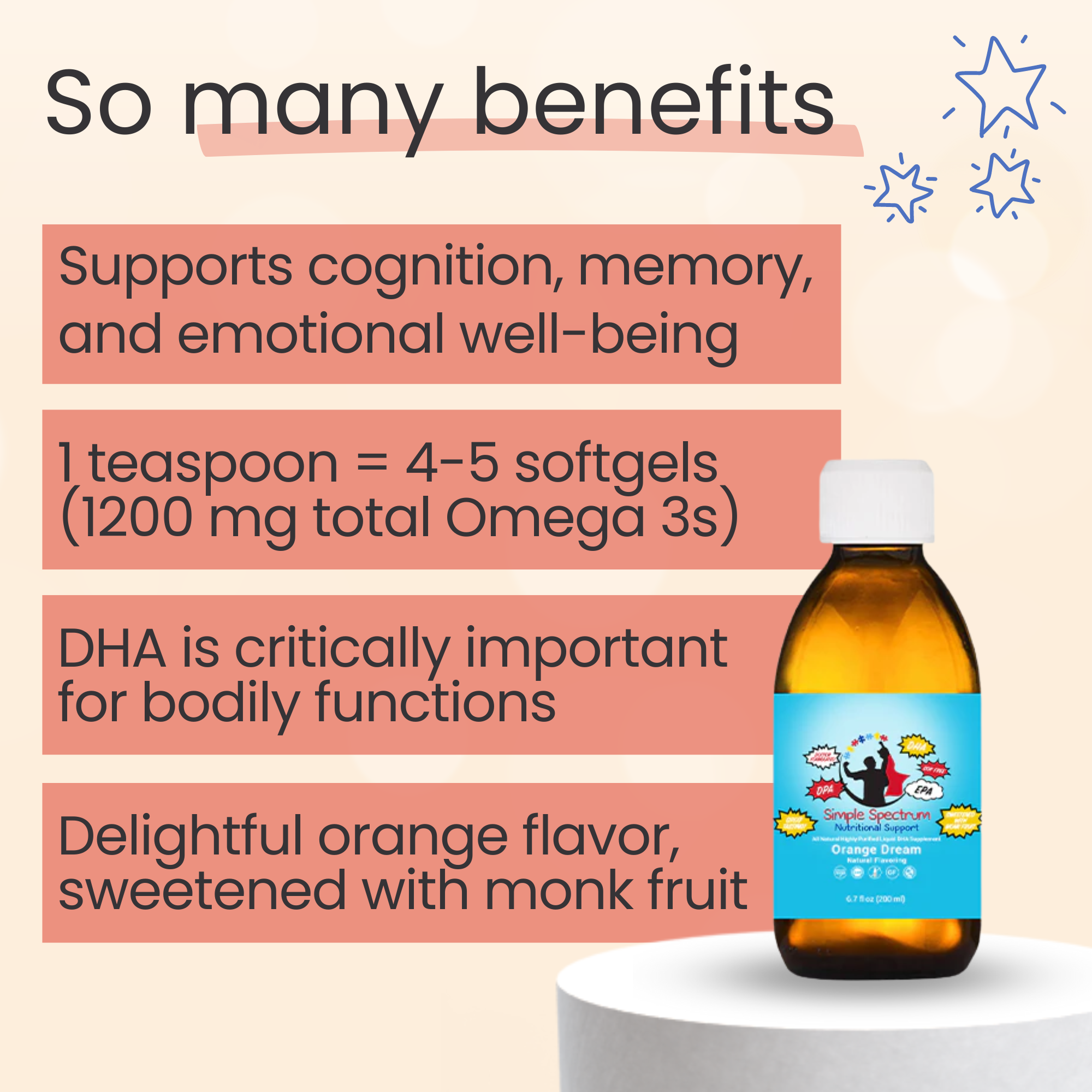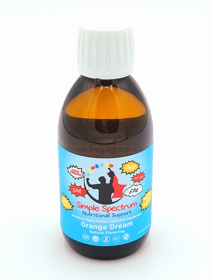 Simple Spectrum Omega 3 DHA supplement is designed with our kids with sensory needs in mind and is a natural flavored liquid, sweetened with monk fruit, with no added soy, gluten, casein, nuts, dairy, GMOs, added sugar, artificial preservatives, or artificial ingredients or flavoring. Our products are all third party tested for purity and quality. The highest quality nutrients in the best forms - it really is quite simple.